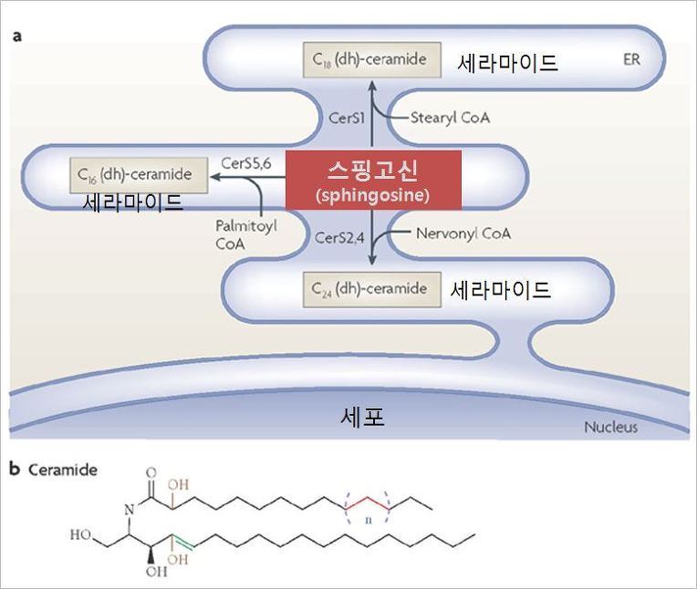 또한, 세포막의 50%는 포화지방으로 구성되어 있으며 외부 바이러스 침입으로부터 세포막을 보호하는 기능을 한다. 세라마이드(ceramide)라 불리는 이 지질은 세포의 활성을 조절하고 세포들의 생사면탈권을 쥐고 있는 스핑고신(sphingshin)의 핵심멤버로 세포핵과 외부 단백질과의 교신을 하는 데 매우 중요한 역할을 담당한다. 이들은 암세포가 커지는 것을 막고 세포자살을 유도하는 매우 중요한 면역작용을 한다.